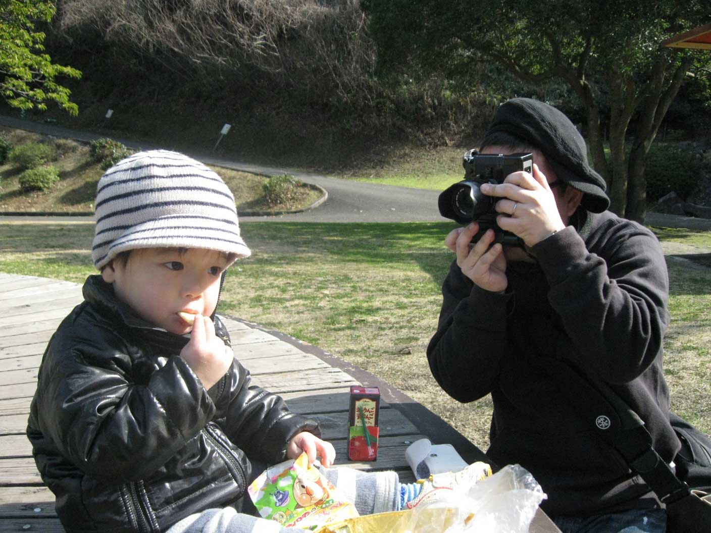 息子 公園で遊びまくって休憩タイム お菓子に夢中