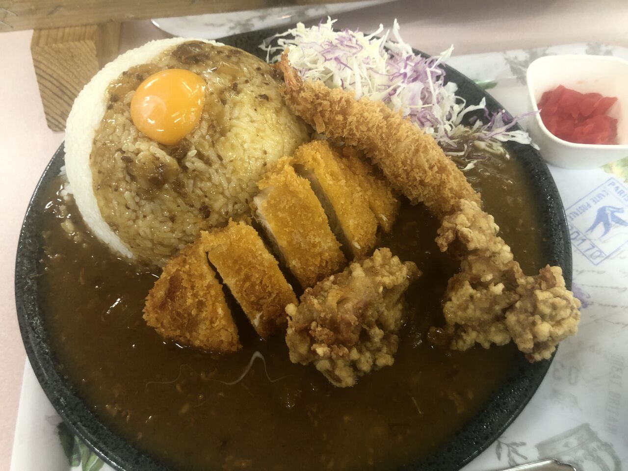 ご飯800g、生卵、とんかつ、唐揚げ2個、大海老フライ、キャベツ